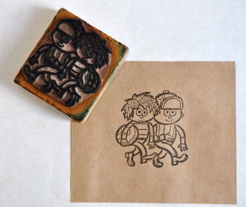 チェコの古道具屋さんで見つけたハンコです。 絵本やアニメーションの登場人物のような、きゅっと真ん中に寄ったまん丸の目。ボールを抱えて、さぁ遊びに行こう! 太いラインの図柄も存在感たっぷり。使い込まれた木の感じもいい味わいです。