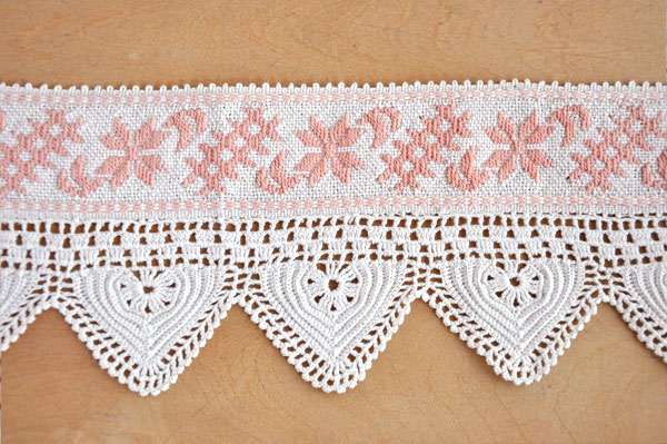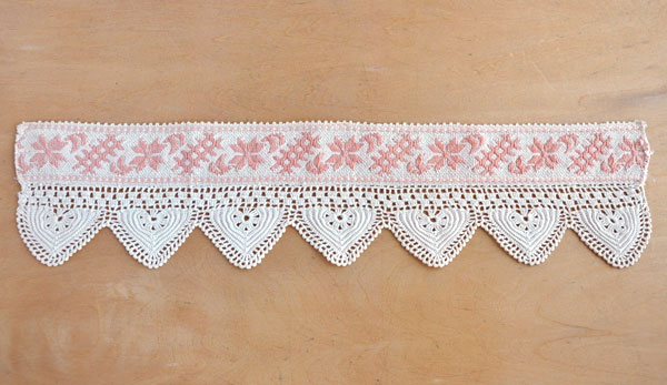 淡いピンク色で星と三日月、格子の模様が織り込まれた幅4cmほどのテープに、手編みのレースを取り付けて棚飾りが作られています。古いヨーロッパでは棚飾りは手作りするのが一般的。各家庭の棚やキャビネットの幅サイズに布やリボンテープをカットして飾り付けます。こちらはスパイスラックのような小さな棚用だったのでしょうか、40cmと少し短め。小さく住まう日本の家庭にも合いそうです。手芸パーツとして素材に使って頂いても。