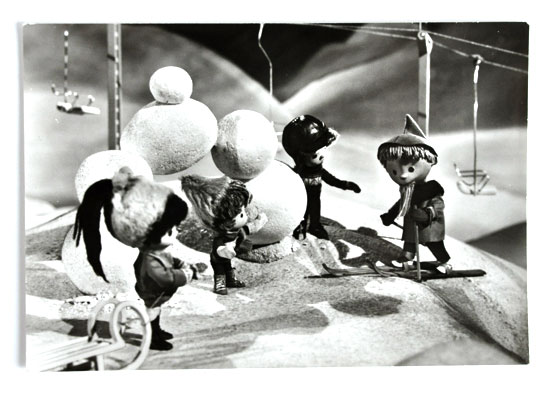 1959年から東ドイツで放映されていた人気テレビ番組「ザントマン」。とんがり帽子に砂袋、あご髭を生やした小さな妖精パペットは、毎日いろんな場所を冒険し、楽しいお話をたくさん聞かせてくれる子供達の人気者。そんなテレビのワンシーンがポストカードになっています。